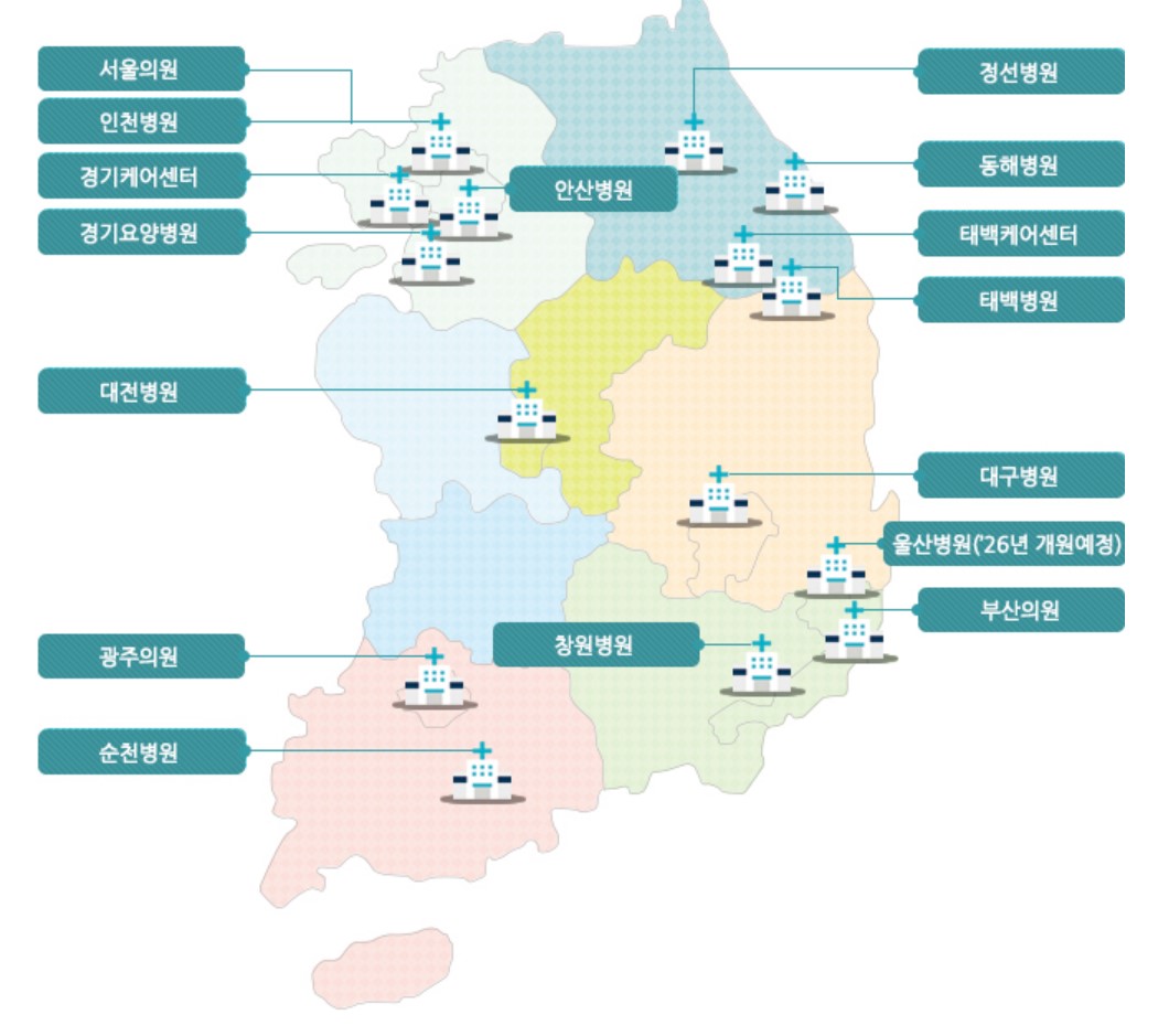 근로복지공단은 전국에 근로복지공단 병원에서 산재상병에게 풍부한 임상경험이 있는 전문의 진료 및 첨단의료장비로 근로자의 건강예방, 질병치료, 재활을 하여 산재근로자의 직업 및 사회 복귀를 지원하고 있습니다. 척추센터, 심혈관클리닉, 소화기 클리닉, 호흡기 클리닉, 복강경 클리닉, 신경통증 클리닉, 대장항문 클리닉, 내분비내과, 유방클리닉, 정맥류 클리닉, 비만 클리닉 등 전문 진료를 시행하고 있습니다.