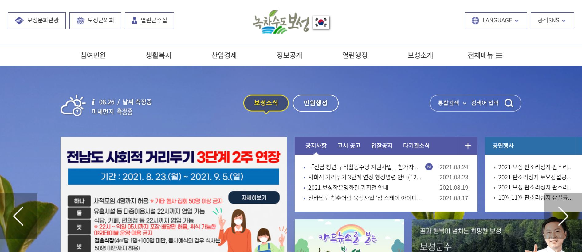 보성군청 홈페이지의 새소식 그리고 공지사항을 볼 수 있습니다.