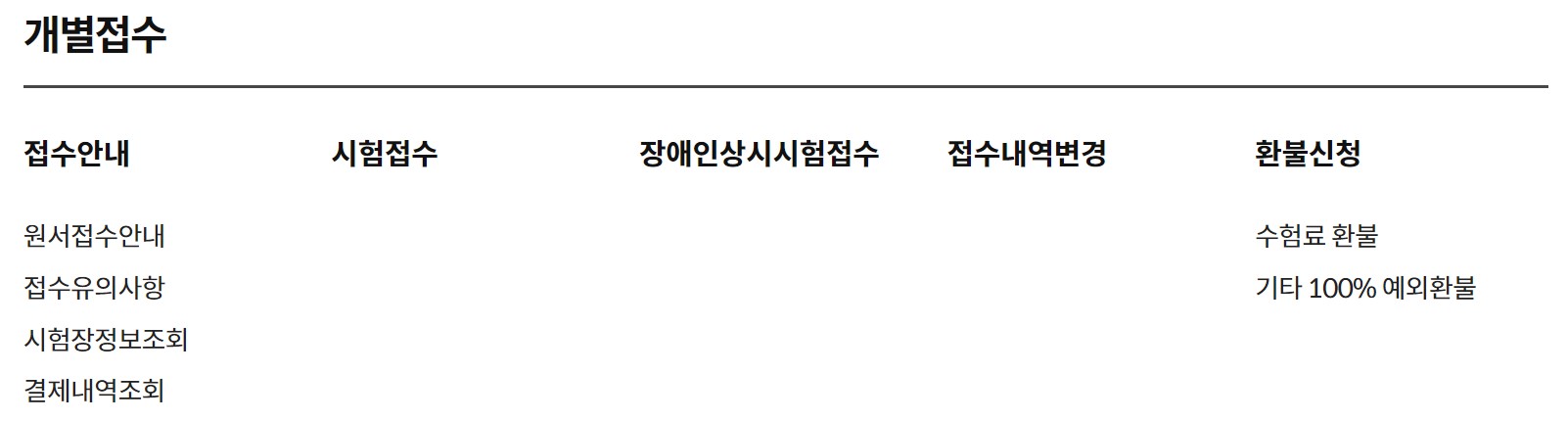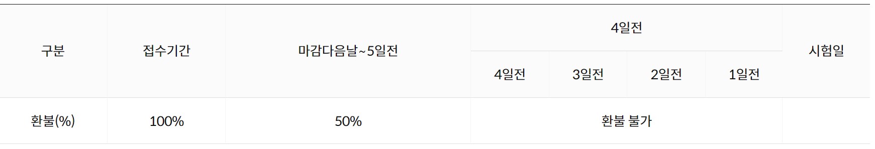 - 접수마감일 다음날부터 시험일 5일 전까지 접수를 취소하는 경우 50% 환불(접수수수료 제외)