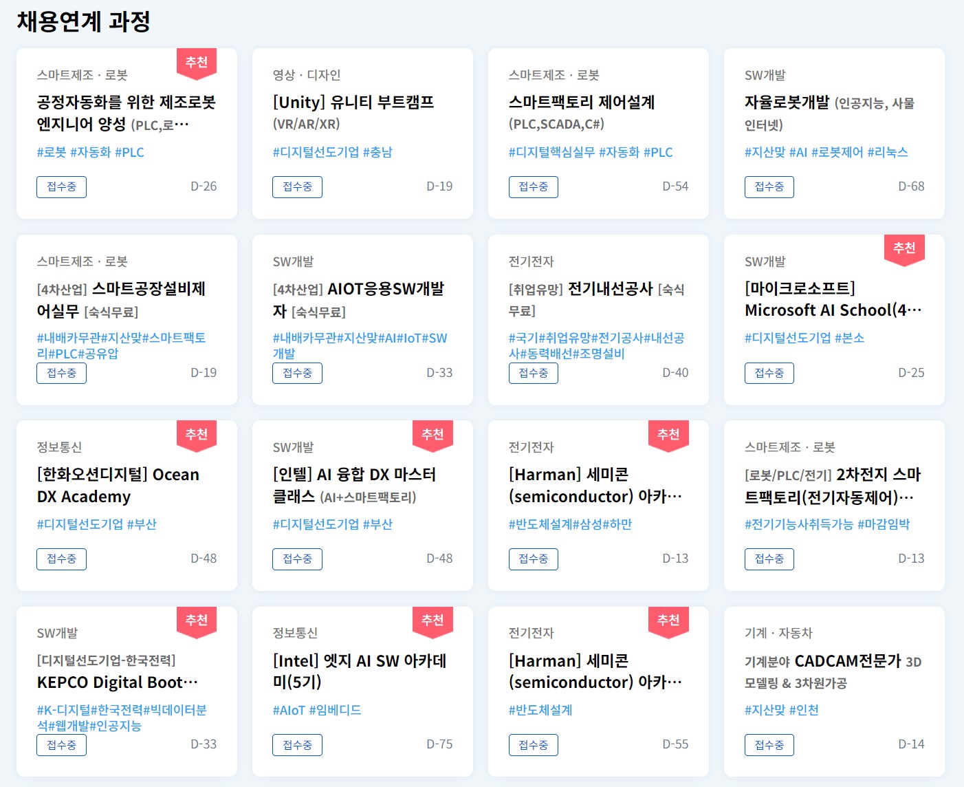채용담당자를 위한 인재 추천 신기술 분야의 현장실무 역량을 갖춘 전국의 우수한 인재들을 지금 바로 확인해 보세요! K-디지털 트레이닝 / 국가기간전략산업직종훈련