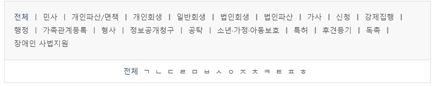 민사, 개인파산/면책, 개인회생, 일반회생, 법인회생, 법인파산, 가사, 신청, 강제집행, 행정, 가족관계등록, 형사, 정보공개청구, 공탁, 소년가정아동보호, 특허, 후견등기, 독촉, 장애인 사법지원의 양식을 확인 및 다운로드할 수 있습니다.