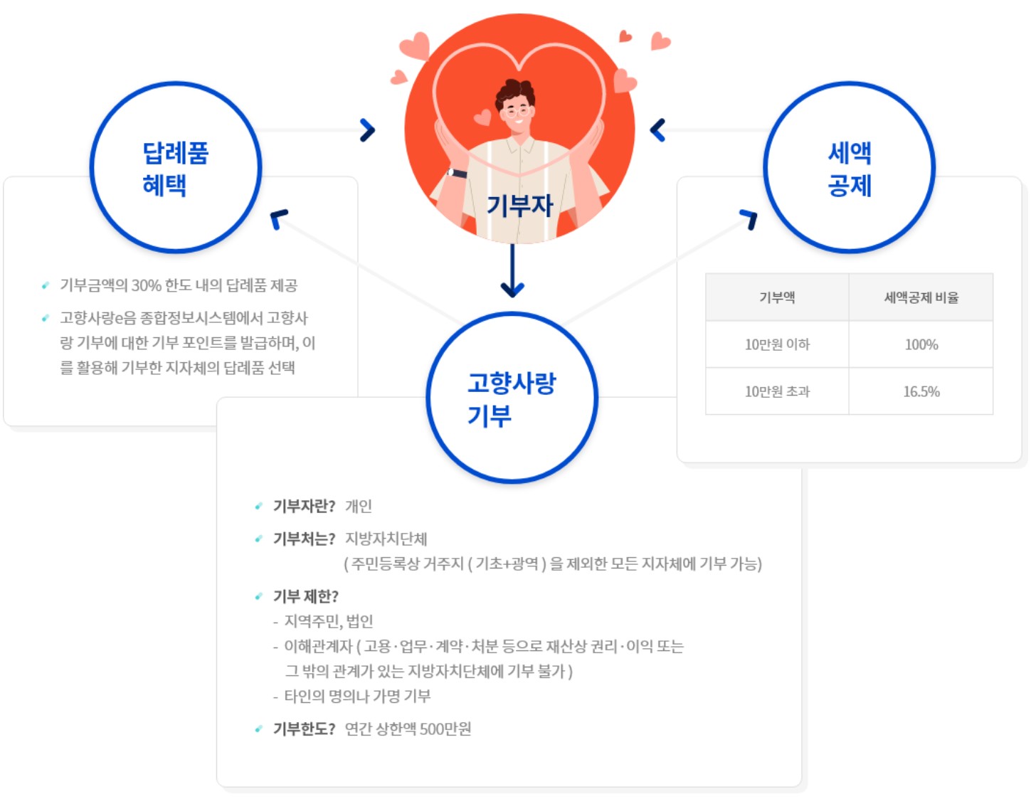 요즘 각 지자체에서 고향사랑기부제를 실시해서 이슈를 몰고 있습니다. 고향사랑기부제는 개인이 고향에 기부하고 지자체가 기부금을 모아 주민복리에 사용하는 제도인데요. 기부자는 고향사랑 기부에 대한 세액공제 혜택과 기부한 고향의 답례품을 받을 수 있어요!