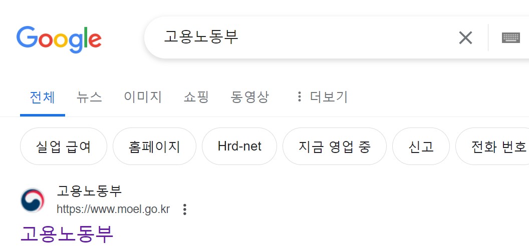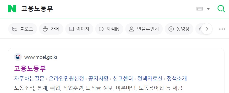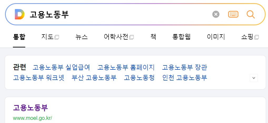 고용노동부 홈페이지를 이용하려면 네이버, 다음, 구글 등에 고용노동부를 입력하고 검색합니다.