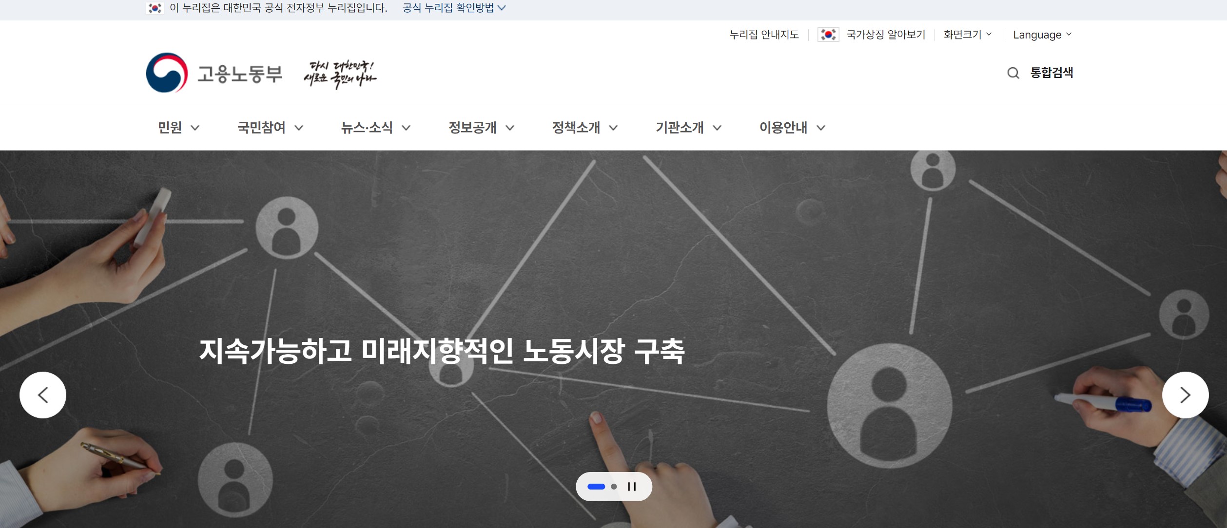 지속가능하고 미래지향적인 노동시장 구축 노동의 가치가 존중받는 사회를 만들겠습니다. 이전 슬라이드 다음 슬라이드 자동 넘김 정지 자동 넘김 재생