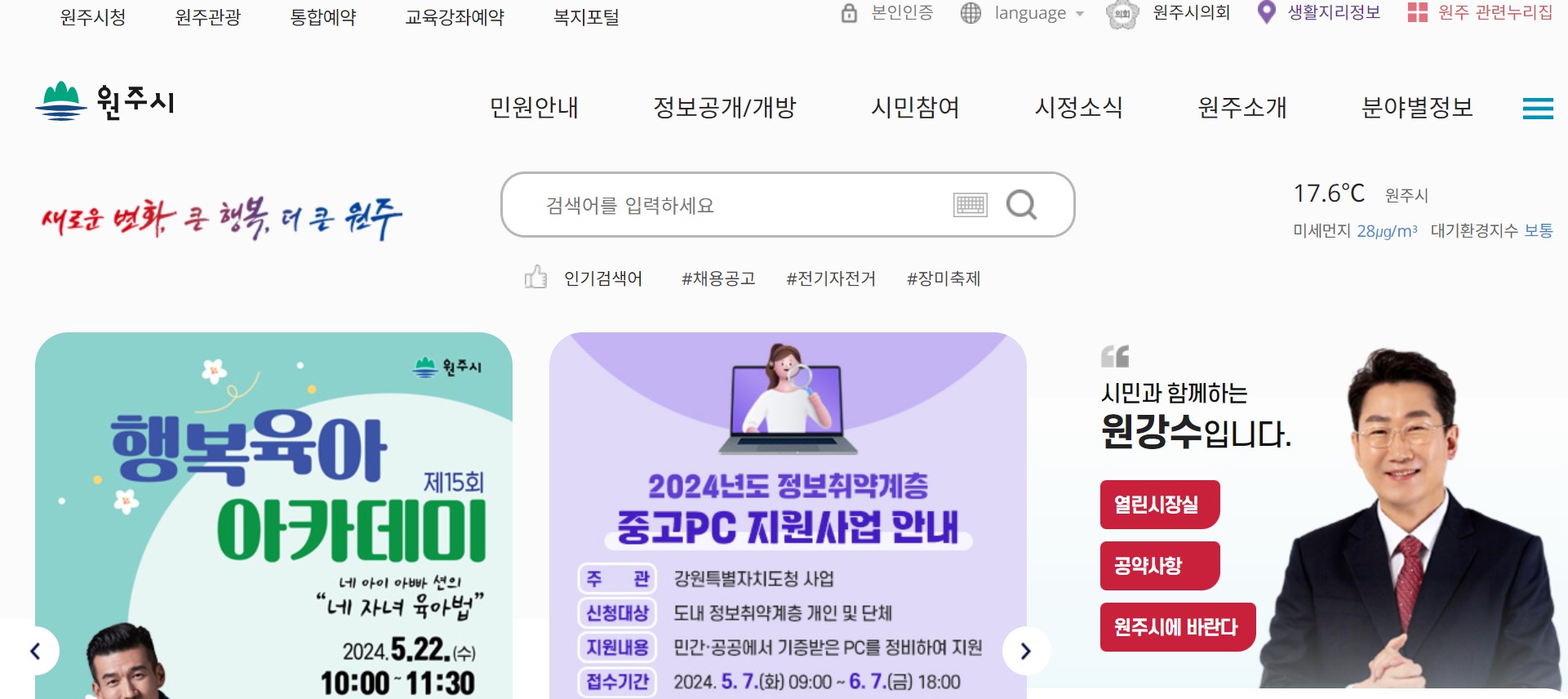 원주시청 홈페이지 메인화면입니다.