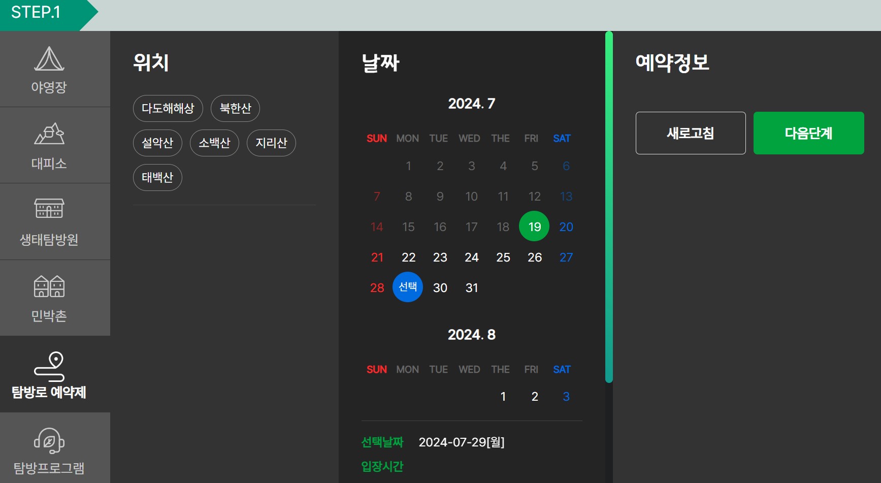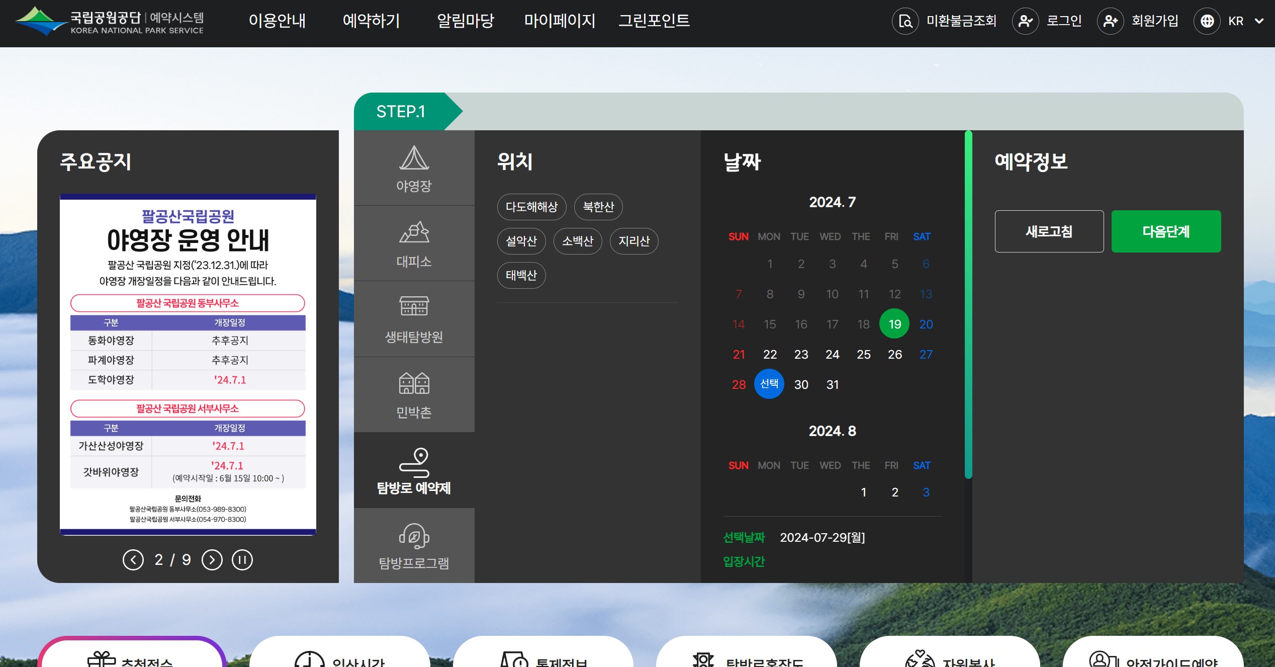 3) 예약하고자 하는 야영장, 대피소, 생태탐방원, 민박촌, 탐방로, 탐방프로그램과 날짜 예약 정보를 선택하고 예약을 진행합니다.