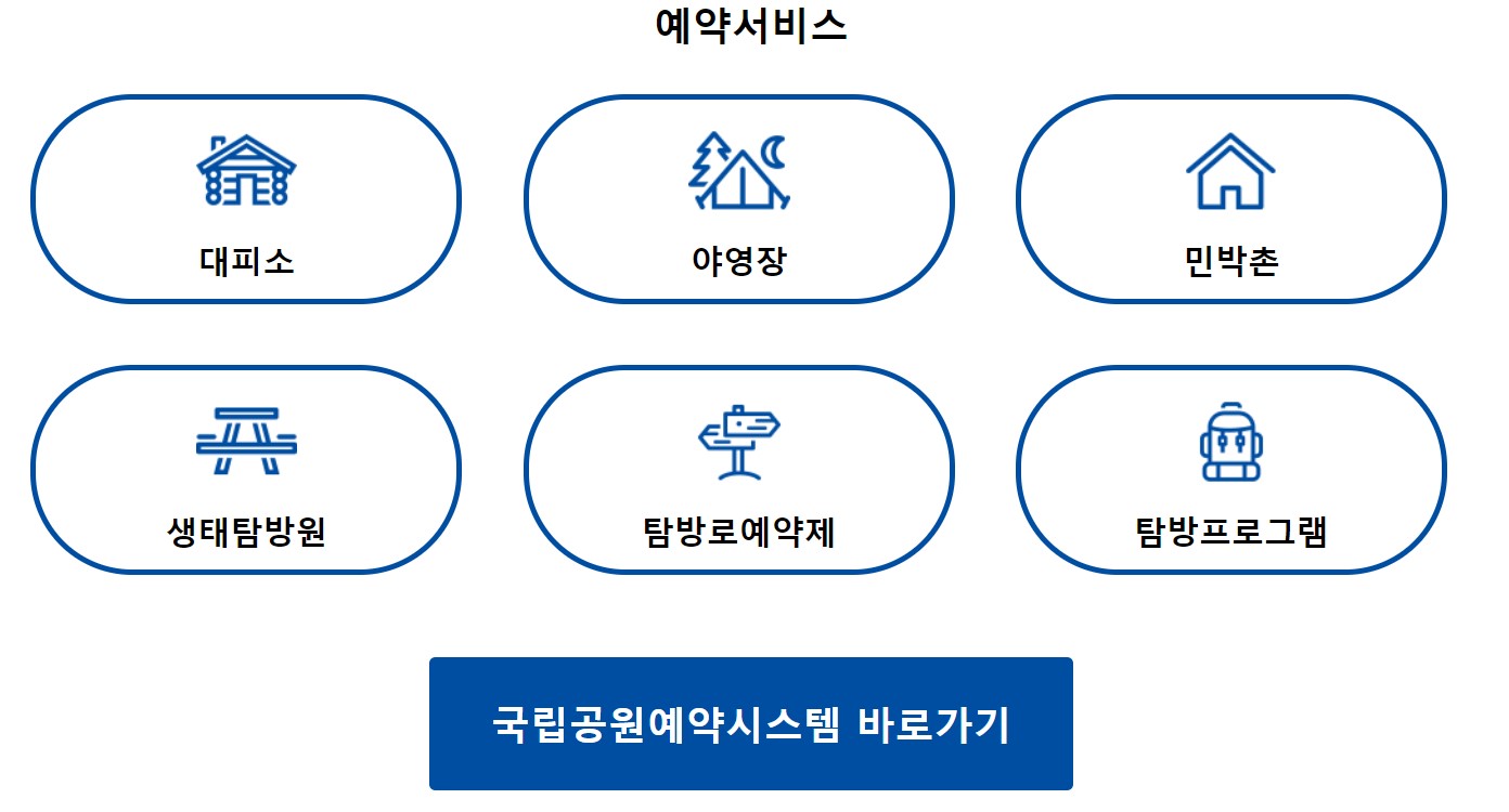 국립공원 예약 통합시스템은 생소하시죠~? 이곳은 국립공원의 예약을 한곳에서 할 수 있는 홈페이지입니다. 방문을 원하는 국립공원의 야영장, 대피소, 생태탐방원, 민박촌, 탐방로, 탐방프로그램 등을 사전에 확인하고 예약할 수 있습니다.