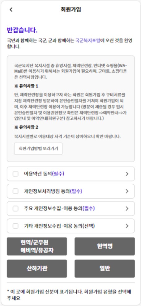 1) 회원가입 : 현역 군인(하사이상), 예비역, 군무원/군무원 퇴직자, 국방부 공무원, 국군 공무직원, 병역명문가, 사관생도, 사관(부사관) 후보생, 국가유공자, 보훈대상자(유족증 소지자), 체력단련장 이용대상자