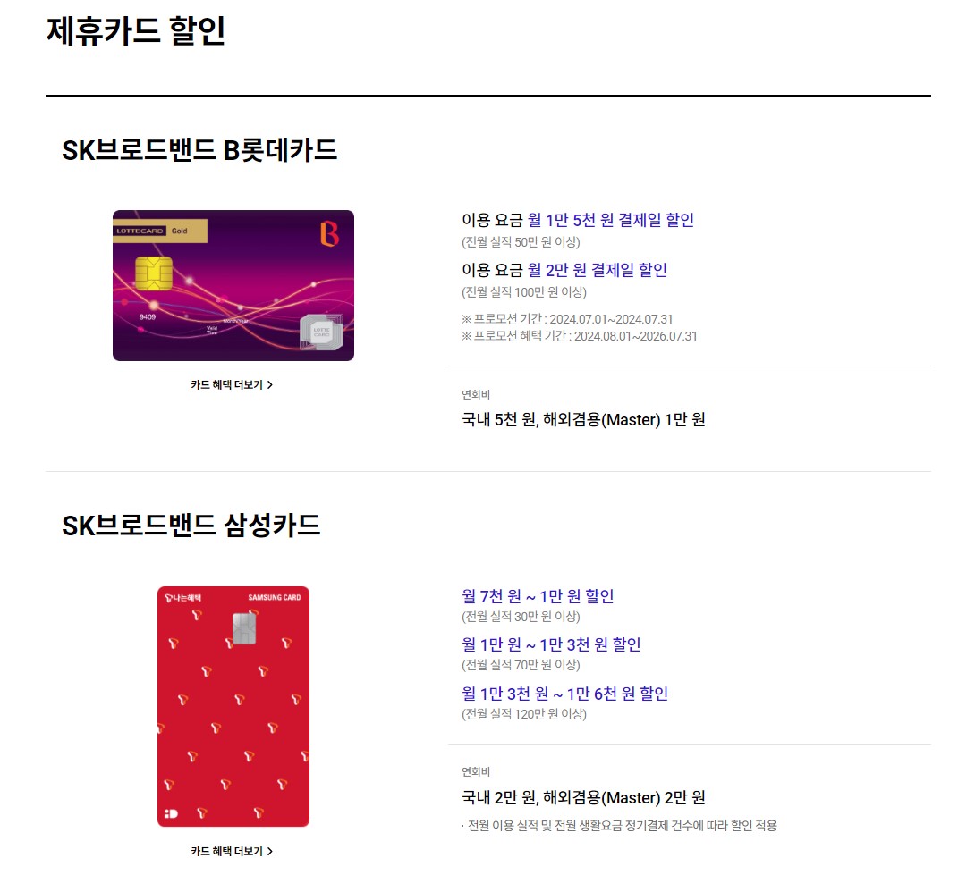 마지막으로 btv 제휴카드 할인을 확인해 보세요. 아래 그림을 터치하면 어떤 카드가 얼마나 할인되는지 알아볼 수 있습니다. 신규 신청을 원할 시에도 아래 그림 터치 시 신청 가능합니다.