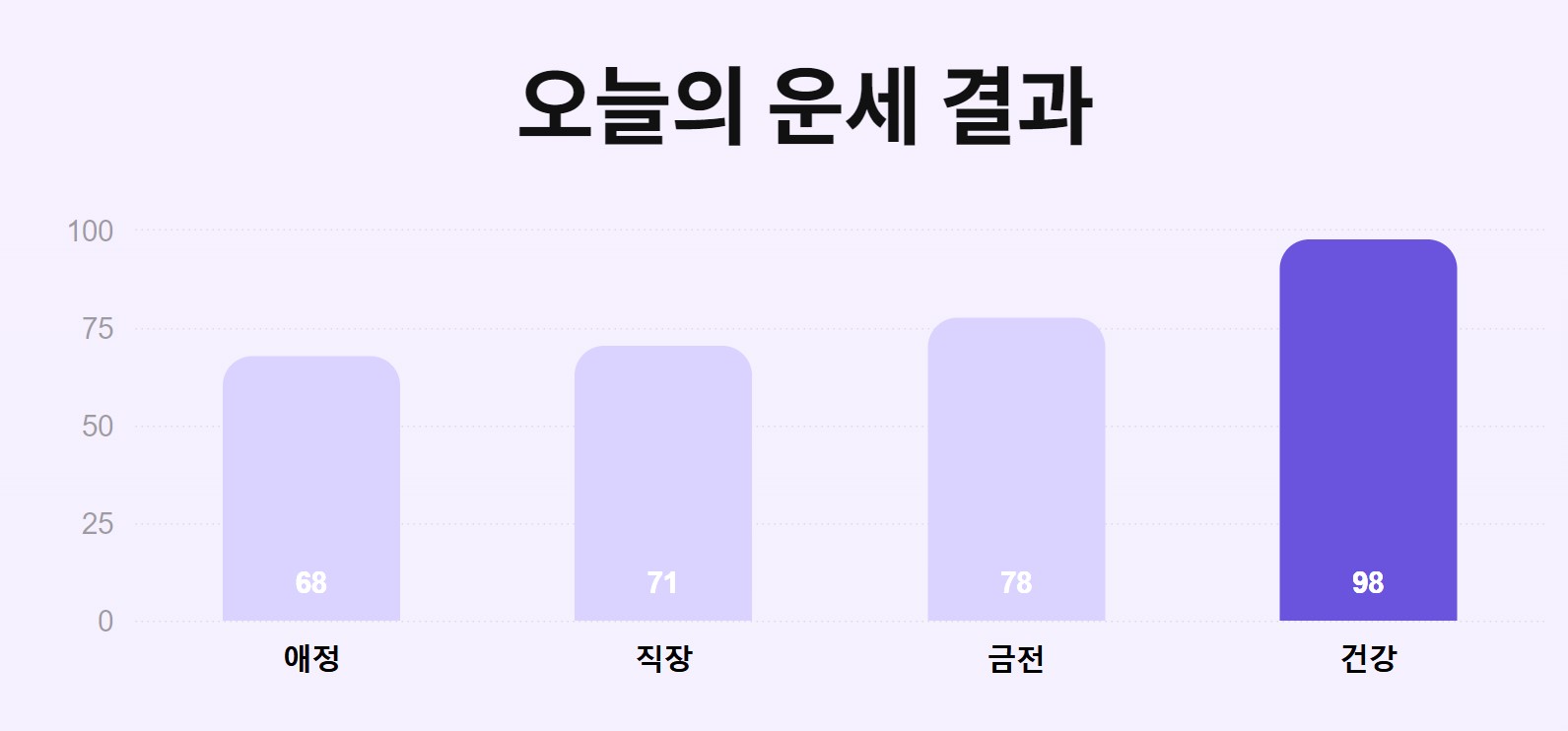 애정·직장·금전·건강 카테고리를 선택하여, 오늘의 운세 결과를 볼 수 있습니다.
