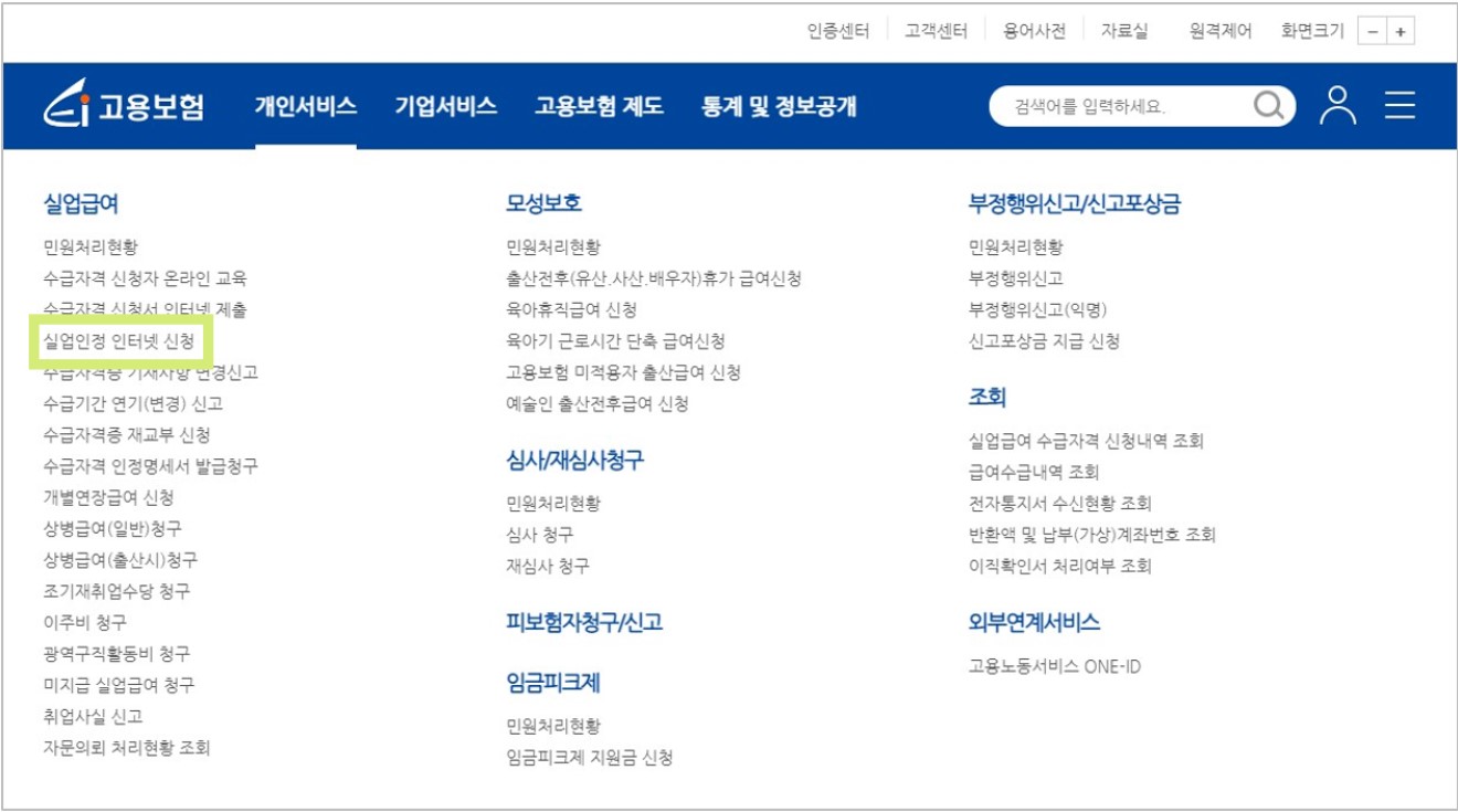 2. 고용보험 홈페이지 메뉴에서 실업급여-실업인정 인터넷 신청 순으로 접근합니다.