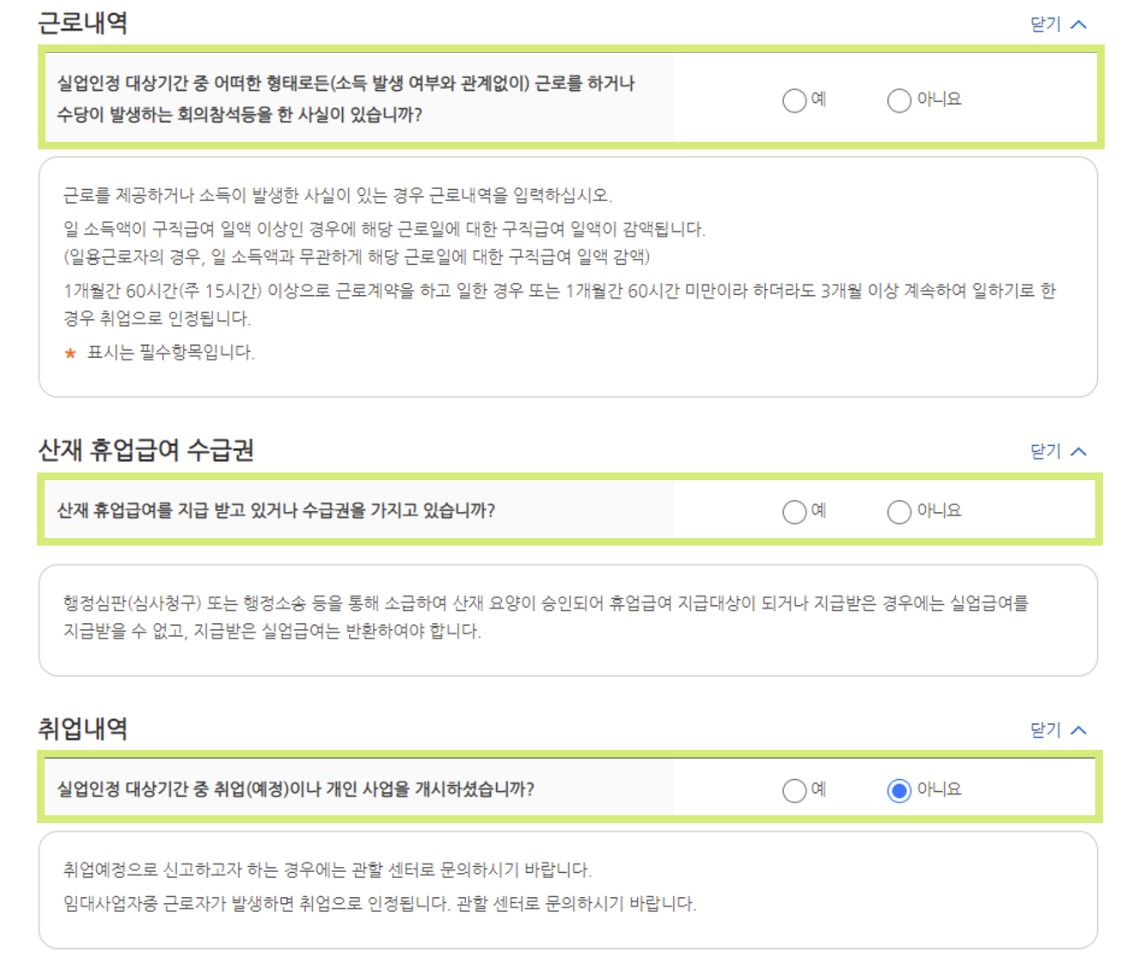 4. 실업인정 대상기간 중 일용근로, 회의참석 등 일시적인 소득이 있는 경우 체크하고 아래 내용을 확인합니다.