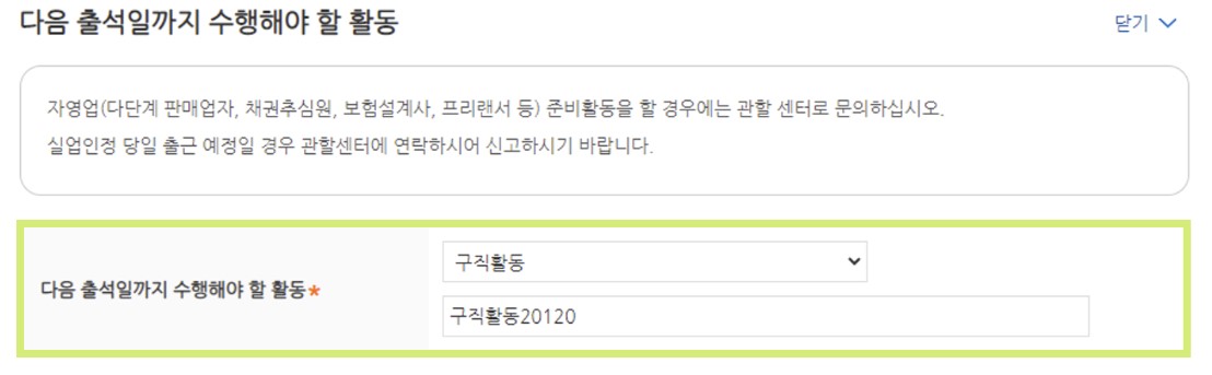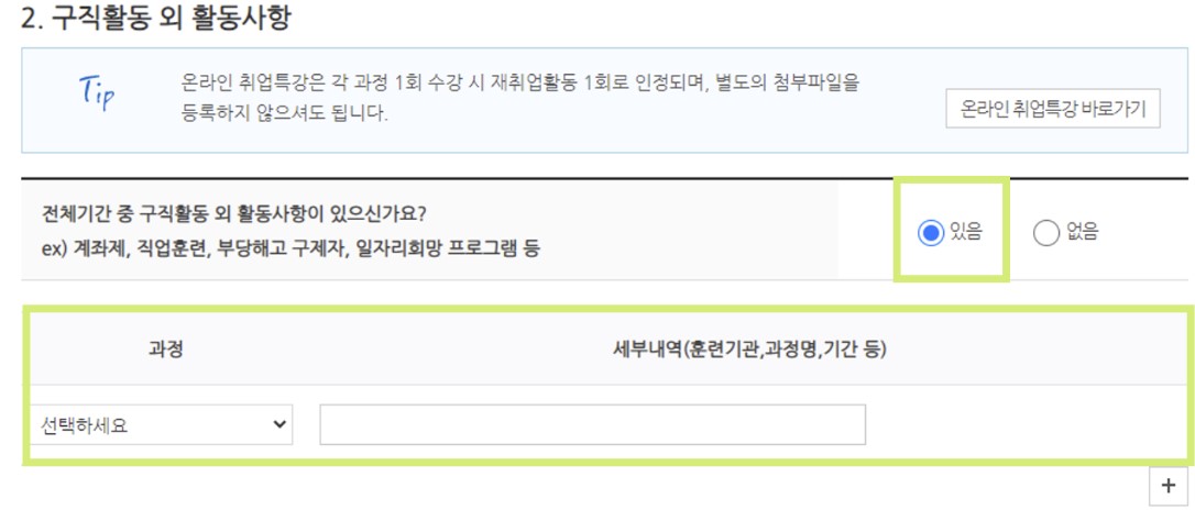 6. 구직활동 외 활동사항이 있는 경우 체크하고 필수 항목을 입력합니다.