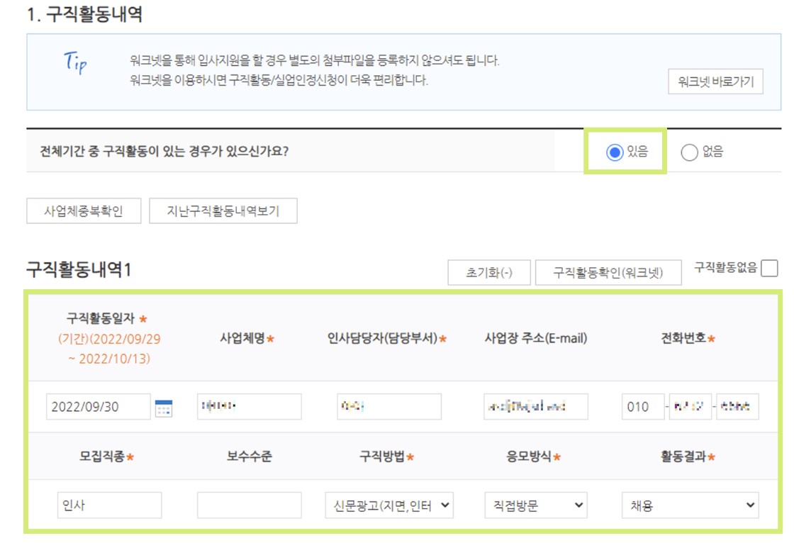 5. 구직활동이 있는 경우 체크를 하고 구직활동 내역의 필수항목을 입력합니다.