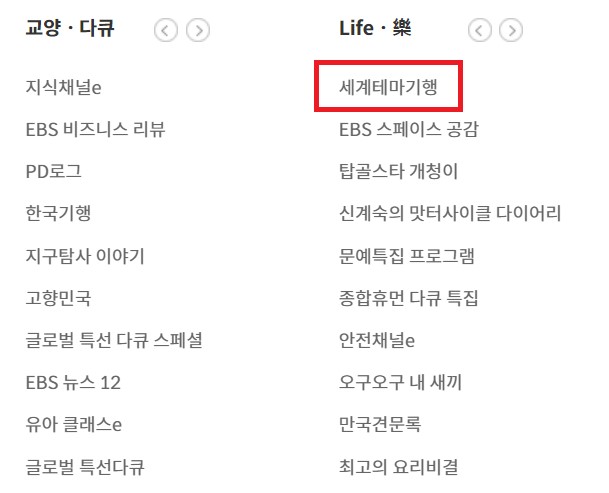 2) ebs 홈페이지 메인화면 전체메뉴 > 세계테마기행을 클릭합니다. (life · 樂 카테고리)