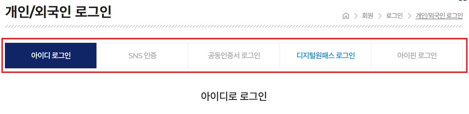 로그인을 합니다. 로그인 방법에는 1) 아이디 로그인 2) sns 인증 3) 공동인증서 로그인 4) 디지털원패스 로그인 5) 아이핀 로그인이 있습니다. 2) sns 인증 로그인은 sns로 간편 인증하는 방법으로 naver 아이디 또는 payco로 로그인할 수 있습니다.