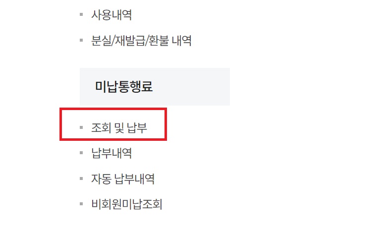 미납통행료 - 조회 및 납부를 클릭합니다.