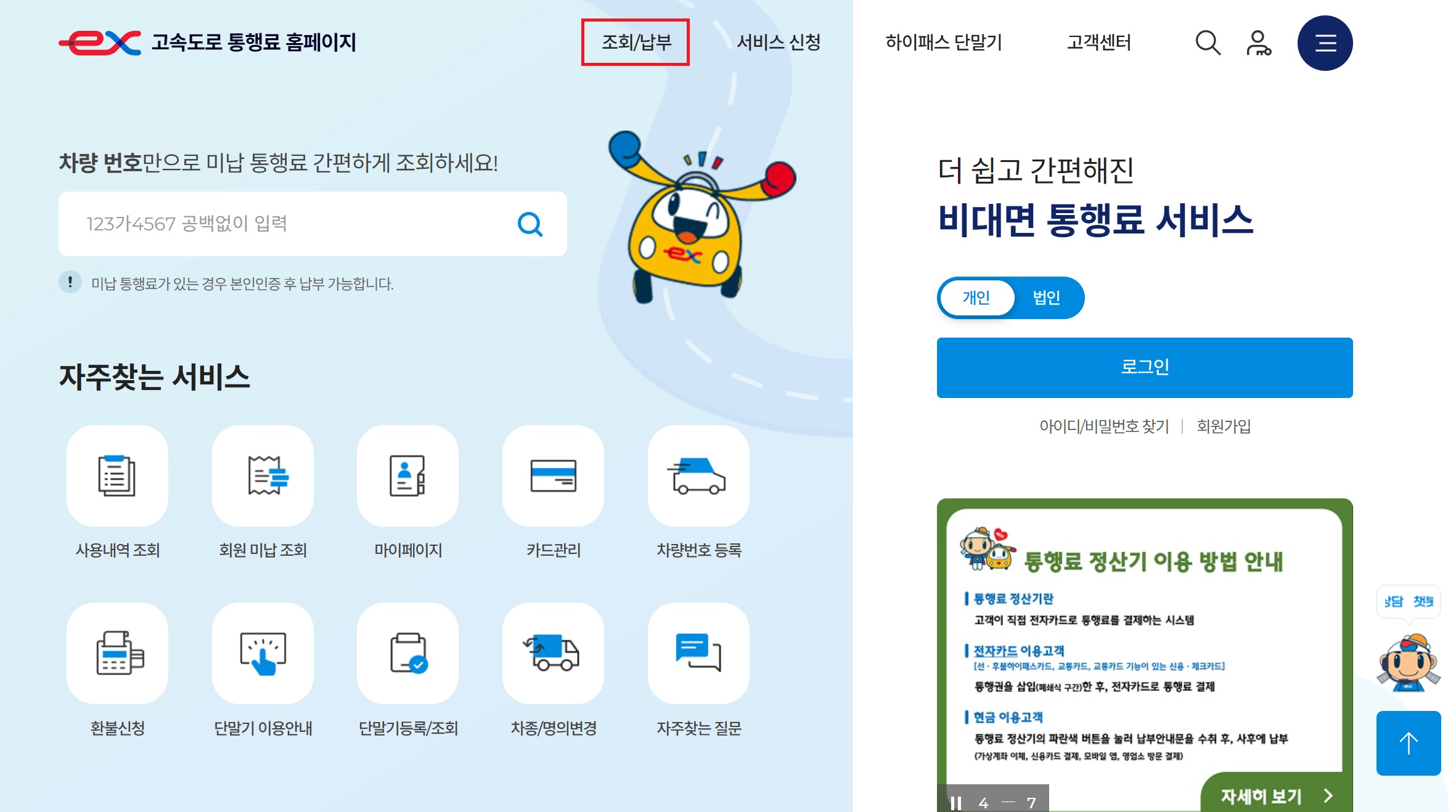 고속도로 통행료 홈페이지 상단 메뉴의 조회/납부를 클릭합니다.