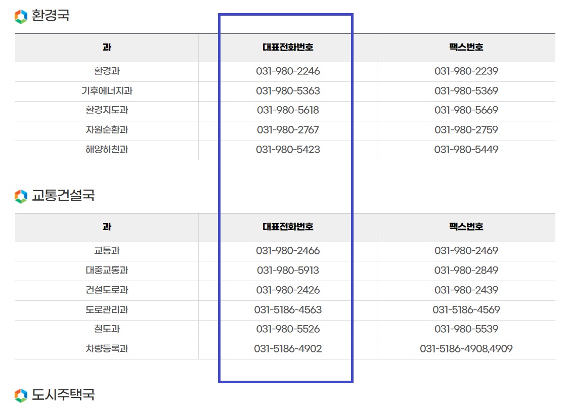 김포시청 환경과, 세무과, 여권과 등 부서 전화번호는 김포시청 홈페이지-시청안내-부서 대표전화(팩스) 번호에서 확인할 수 있습니다.