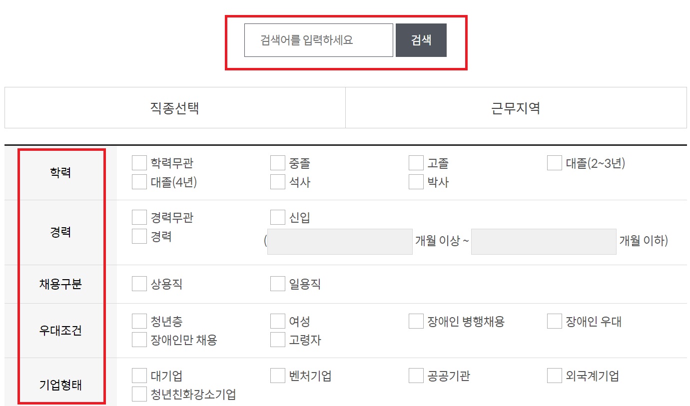검색어를 입력해서 원하는 채용정보를 검색해도 되고, 학력/경력/채용구분/우대조건/기업형태를 선택하여 원하는 조건의 채용정보를 검색해도 됩니다.