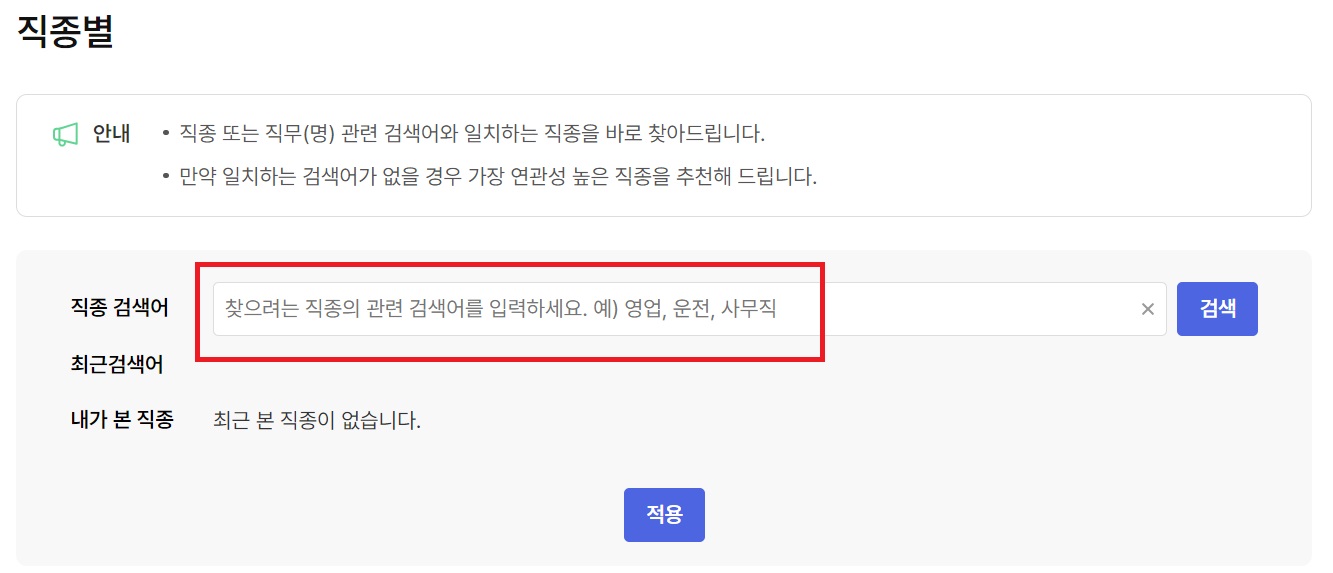 직종별 검색서비스는 특정 직종에 대한 채용 정보를 찾을 수 있습니다. 관심 있는 직종을 직종 검색어란에 입력하고 검색을 합니다. 검색한 직종에 맞는 채용 공고만을 보여줍니다.
