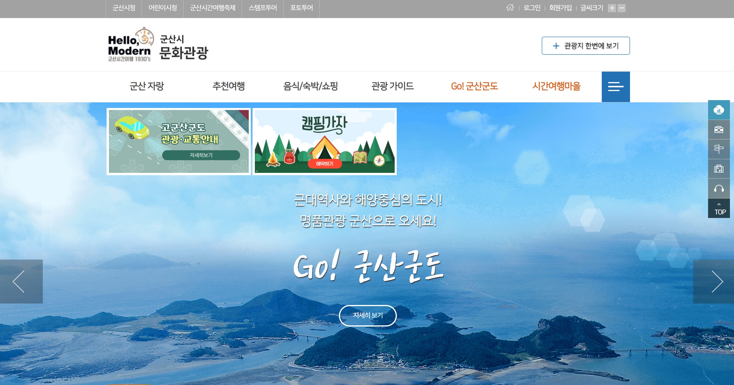 군산시청 홈페이지>군산시 문화관광에서는 군산시의 다양한 축제, 추천 여행, 한식 일식 중식 분식 탕류, 숯불구이 등 맛집, 장자도 어청도 관리도 방축도 명도 말도 연도 개야도 여객선 시간표, 섬여행에 대한 꿀팁을 알려드리고 있습니다. 놓치지 마시고 군산시 문화관광 홈페이지에서 꿀팁을 가져가세요!