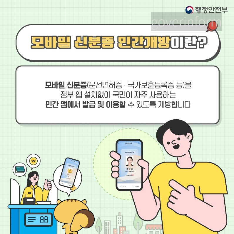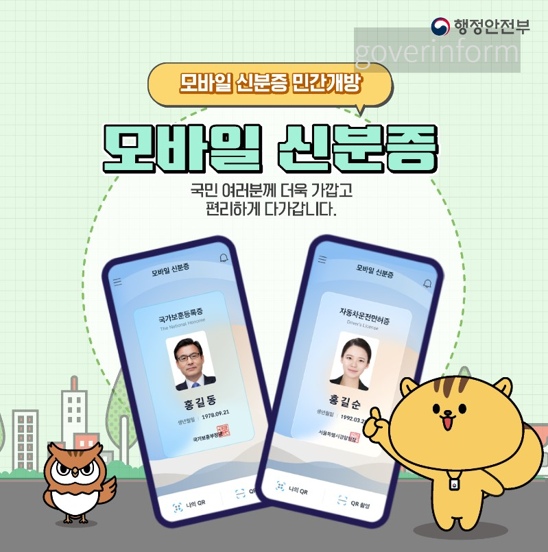 모바일 신분증은 실물 신분증과 동일한 법적 효력이 있는 국가 신분증이며 신원확인이 필요한 금융업무, 편의점, 술집 등 성인인증, 관공서 업무 등 모든 곳에서 사용이 가능합니다.