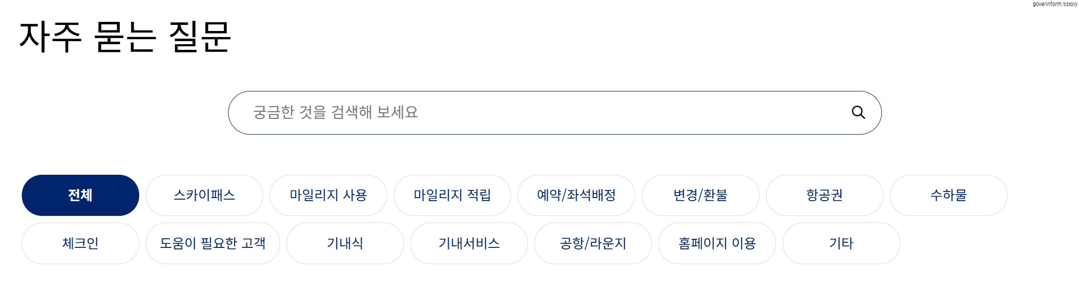 대한항공 자주 묻는 질문에서 키워드 입력 또는 문의사항을 선택하면 질문과 함께 답변을 바로 확인할 수 있습니다.