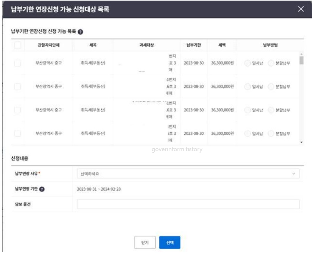 2) 납부기한 연장신청 가능 신청대상 목록에서 납부기한 연장신청 대상을 선택합니다.