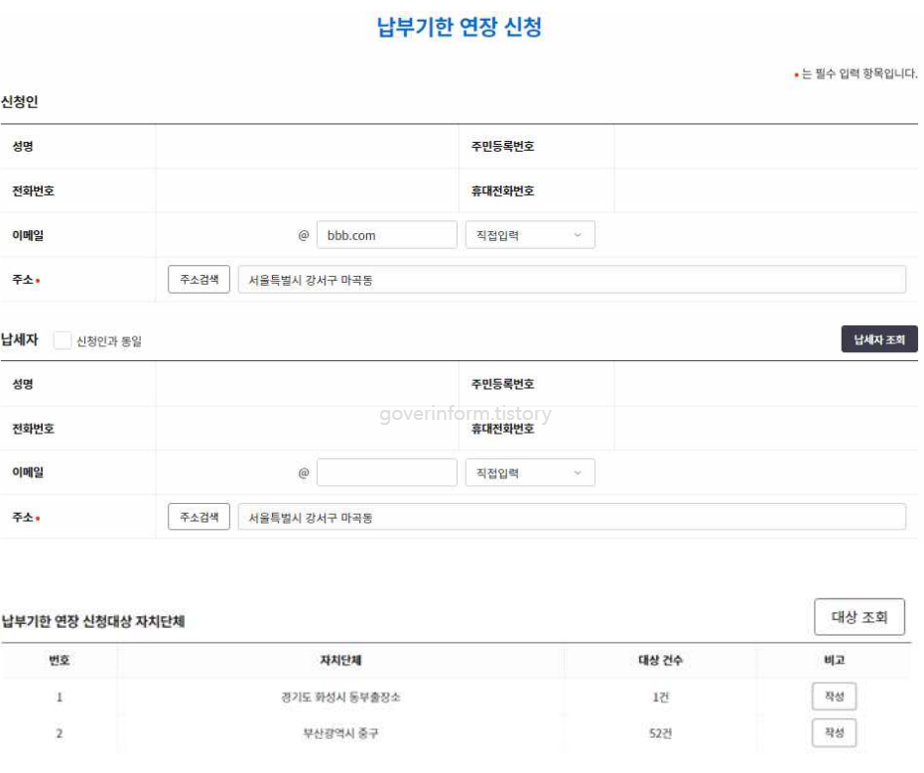 납세자는 로그인 사용자의 납세자 번호가 입력되고, 신청인과 동일을 체크하여 신청인 정보와 동일하게 입력할 수 있습니다.