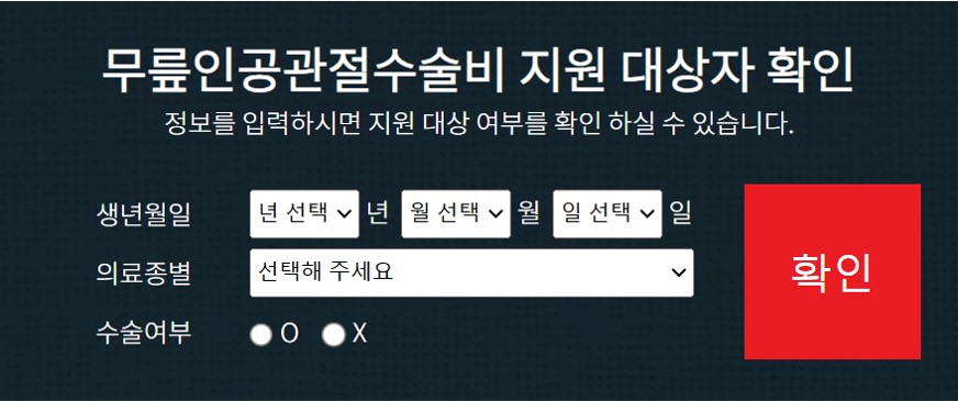 아래 링크에서 무릎인공관절수술비 지원 대상 여부를 쉽고 간편하게 확인할 수 있습니다.