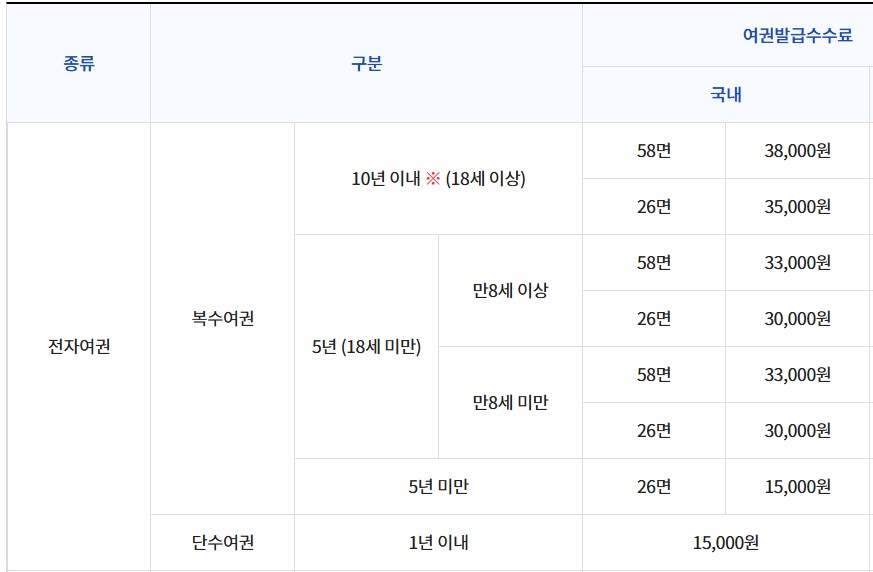 전자 및 비전자여권, 단수 및 복수 여권 등에 따라 수수료가 상이하니