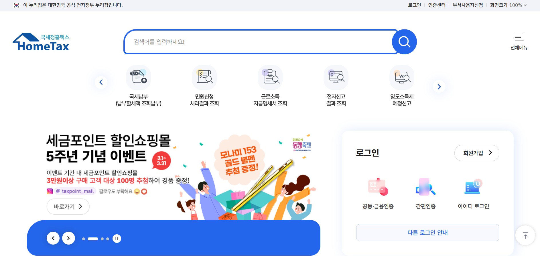 국세청 홈택스 홈페이지는 세무 업무를 온라인으로 쉽고 빠르게 처리할 수 있는 홈페이지이다. 세금 신고, 납부, 서류 발급 등 다양한 세무 관련 서비스를 제공하며, 누구나 손쉽게 이용할 수 있다. 홈택스를 통해 세무 업무를 쉽고 빠르게 처리하고, 더 이상 세금 관련 스트레스를 받을 필요 없이 편리하게 일상적인 세금 업무를 해결해 보자.
