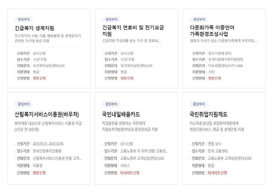 보조금24 홈페이지에서 보조금 조회 및 신청까지 할 수 있어서 기관이나 기관별 홈페이지를 일일이 방문하지 않고도 본인이 받을 수 있는 혜택을 보조금24 홈페이지에서 시간 장소의 제약을 받지 않고도 확인/신청을 할 수 있습니다. 혜택은 무려 복지, 수산, 농림, 고용, 보훈 등 300여가지가 있으며 개개인별 맞춤형 안내 서비스를 제공하고 있습니다.