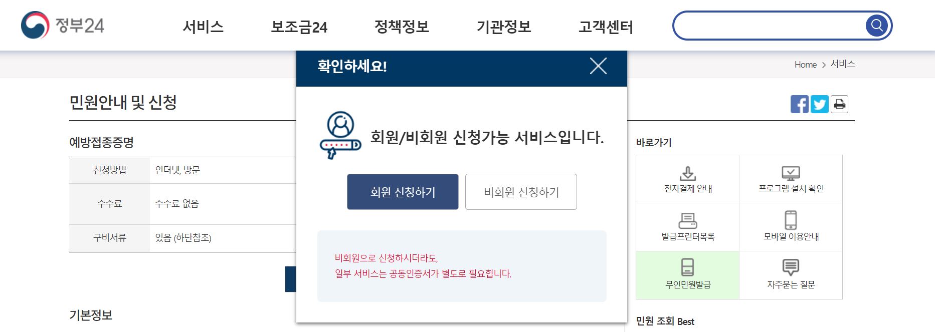 4. 개인별 예방접종증명서를 발급하는 것이기 때문에 본인확인이 필요하며 정부24 회원 / 비회원 모두 신청이 가능합니다.