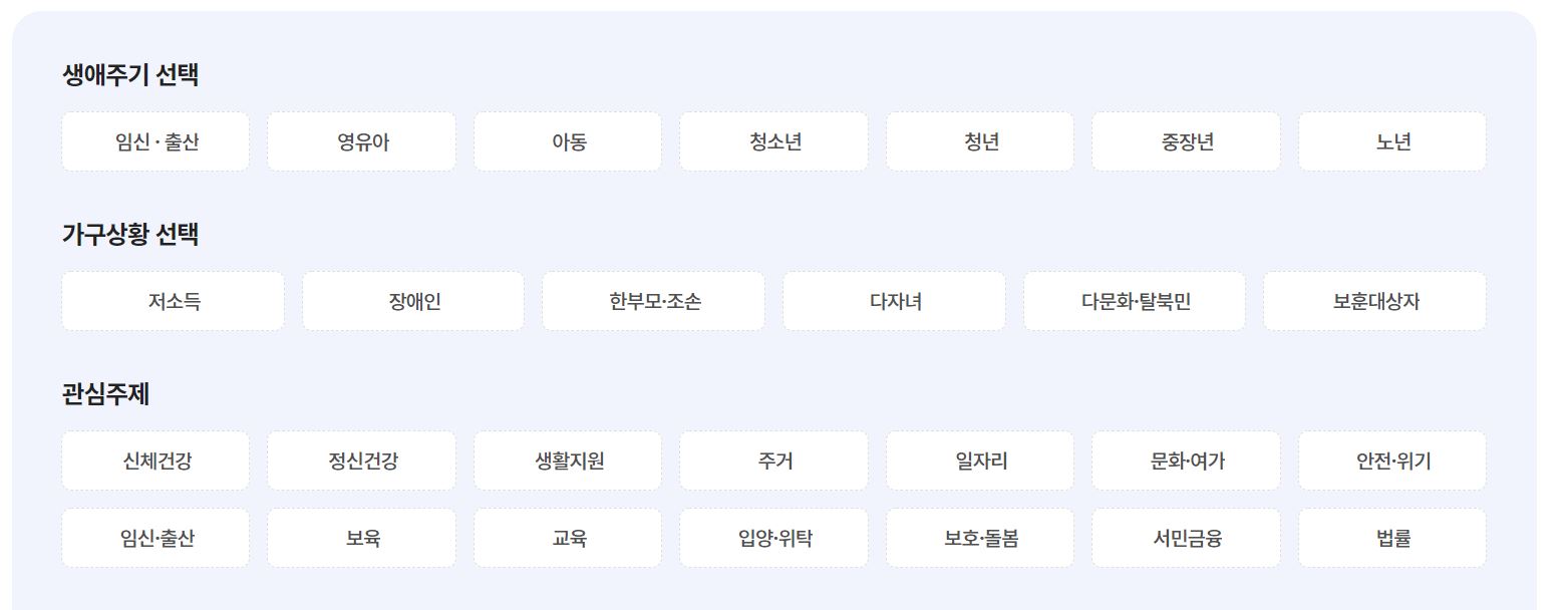 먼저 복지서비스를 찾으려면 내 상황(생애주기/가구 상황/관심 주제/나이 입력/지역/키워드 입력)을 입력하여 찾을 수 있습니다.