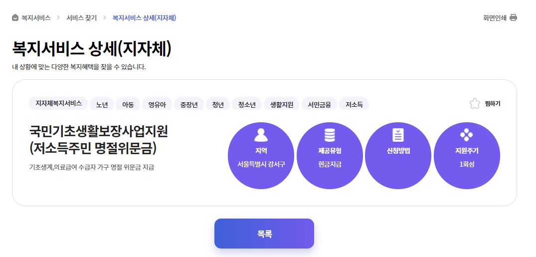생애주기 중장년, 가구 상황 저소득, 관심 주제 생활지원 나이와 지역을 입력했더니 다음과 같이 결과를 볼 수 있는 화면이 나옵니다.