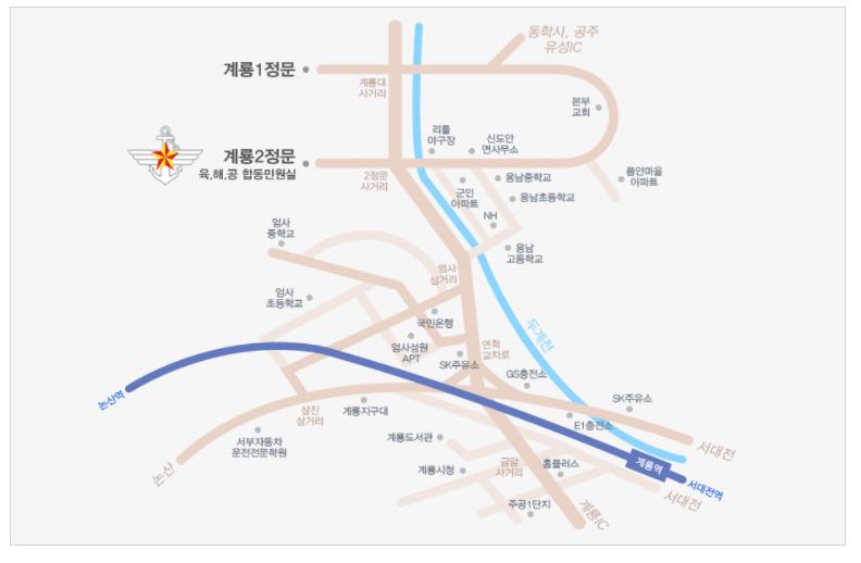 이번에는 육군본부 위치를 알아보겠습니다. 육군본부는 대전역 하차 후 버스를 이용하면 계룡대 입구까지 갈 수 있습니다. 근처 역에서 계룡역까지 도착한 후에 버스를 타면 육군본부에 쉽게 도착할 수 있습니다.