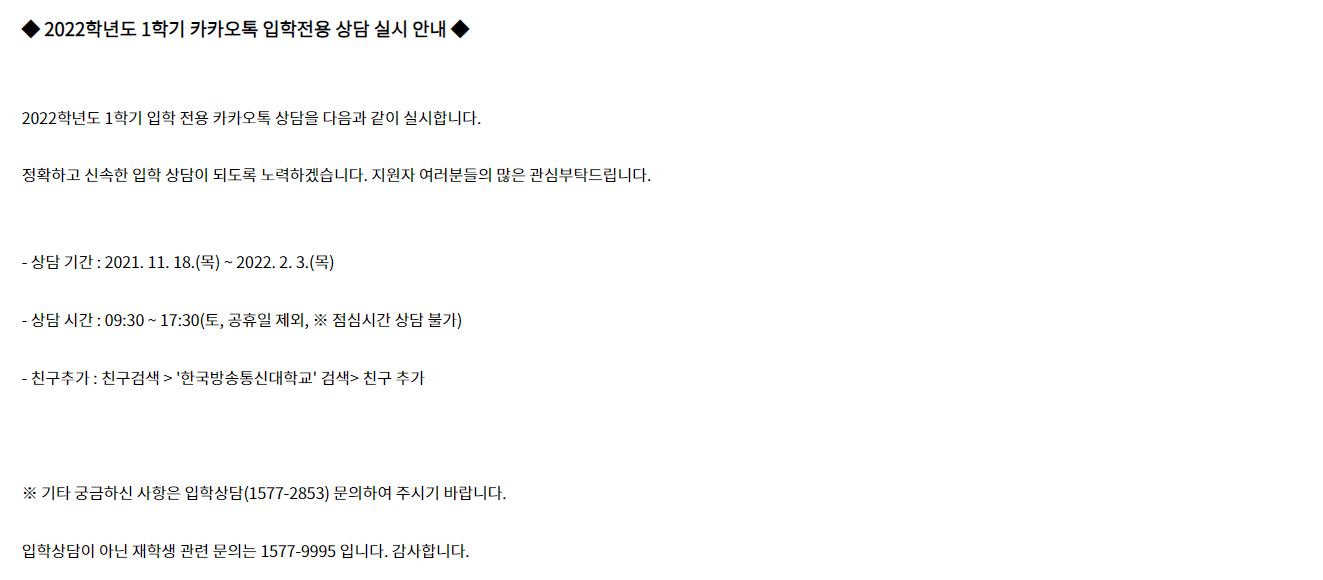 입학 전에 궁금한 것도 많고 어떤 전공을 선택해야 할지부터 입학 후에는 어떨지 입학원서작성 시 궁금한 점 등 다양하게 궁금점이 생기기 마련인데요 한국방송통신대학은 카카오톡 입학 전용 상담을 실시하고 있습니다. 11월부터 2월까지 한시적으로 진행이 되며 상담시간은 평일 오전 9시 30분부터 오후 5시 30분까지 진행됩니다.