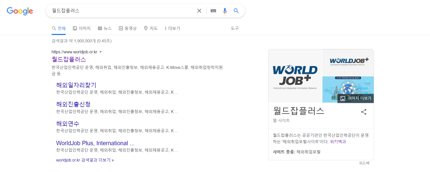 포털 검색창에 월드잡 플러스를 검색하면 다음처럼 홈페이지 주소가 나옵니다.