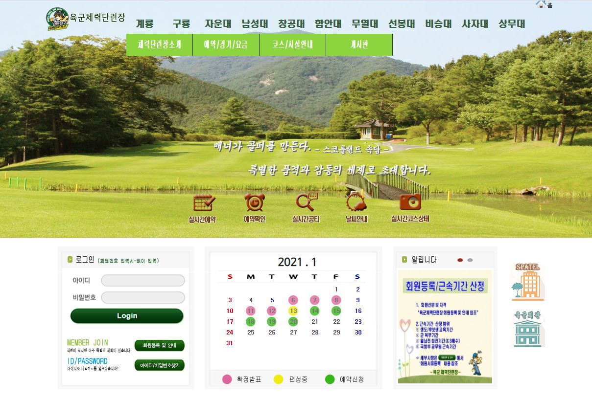 육군체력단련장 홈페이지에 접속하면 아래와 같은 화면이 보이고 상단에 방문하고 싶은 골프장을 클릭하면 예약을 할 수 있습니다.