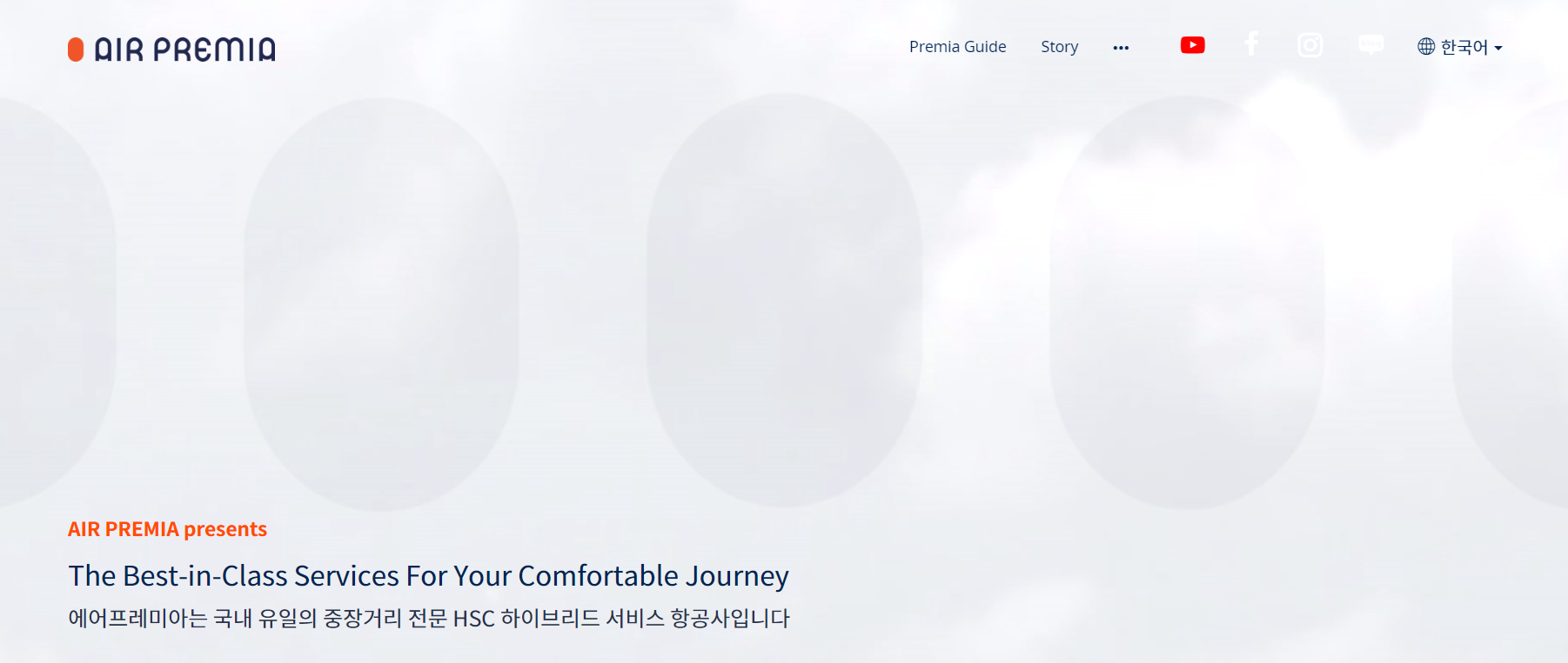 에어프레미아 홈페이지입니다. 하이브리드항공사 느낌답게 차분하고 화사한 느낌을 줍니다.