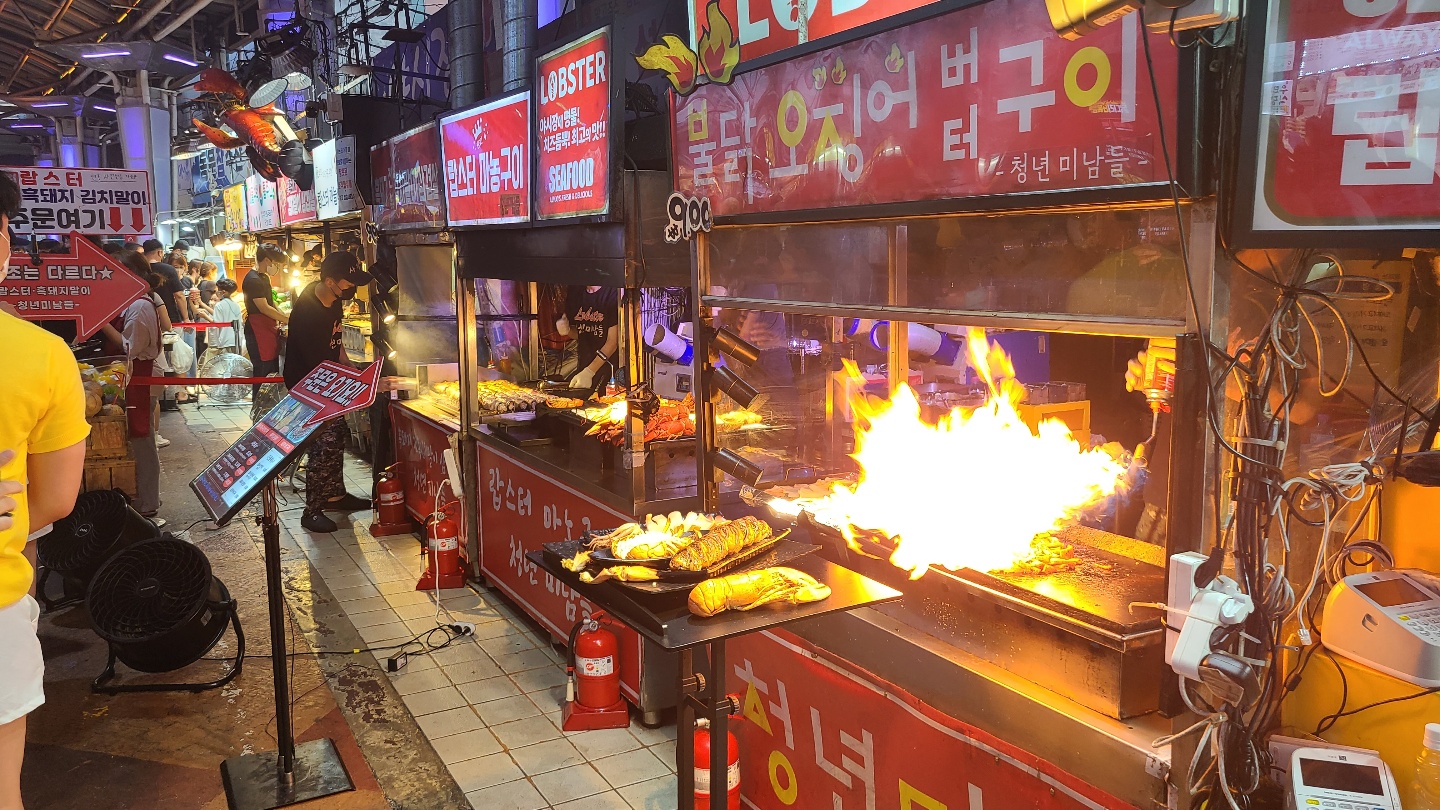 시장을 화려하게 불태웠던 랍스타구이 ㅋㅋㅋㅋ 랍스타 굽는 분이 불쇼해요 - 위험해보여요 ㅠ ㅠ 괜찮은거겠죠?