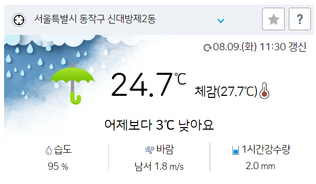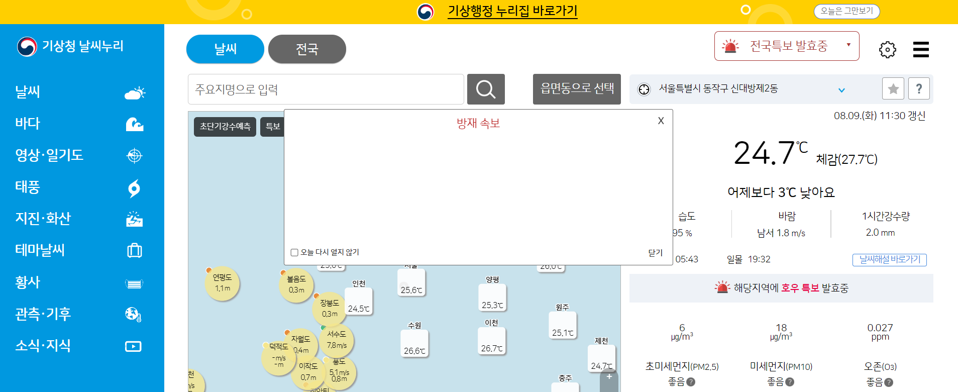 주요 정보는 홈페이지 첫화면에 있습니다. 신대방동을 기준으로 날씨를 살펴볼게요. 습도, 바람, 1시간 강수량까지 나옵니다. 우측에 갱신이라고 쓰여있는곳을 업데이트하면 실시간으로 날씨정보가 업데이트됩니다.