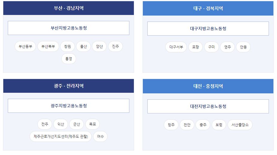 기관명 소재지 우편번호 대표번호 본부 세종 한누리대로 422 정부세종청사 11동 30117 044)202-7114 서울지방고용노동청 서울 중구 삼일대로 363 장교빌딩 04541 02)2231-0009 서울고용복지+센터 서울 중구 삼일대로 363 장교빌딩 04541 02)2004-7301 서초고용센터 서울 서초구 반포대로 43 코스모빌딩 06671 02)580-4900 서울강남지청 서울 강남구 도곡로 408 디마크빌딩 06278 02)584-0009 서울강남고용복지+센터 서울 강남구 테헤란로 410 금강타워 06192 02)3468-4794 서울동부지청 서울 송파구 중대로 135 IT벤처타워 동관 05717 02)403-0009 서울동부고용복지+센터 서울시 송파구 중대로 135 IT벤처타워 3~4층 05717 02)2142-8924 서울서부지청 서울 마포구 독막로 320 테영데시앙빌딩 3층, 5층 04157 02)713-0009 서울서부고용복지+센터 서울 마포구 마포대로 63-8 삼창플라자 1층, 4층, 5층 04157 02)2077-6000 서울남부지청 서울 영등포구 선유로 120 07262 02)2639-2100 서울남부고용복지+센터 서울 영등포구 선유로 120 07262 02)2639-2300 서울강서고용복지+센터 서울시 강서구 양천로57길 10-10 탐라영재관 2,3층 07526 02-2063-6700 서울북부지청 서울 강북구 한천로 949 01137 02)950-9880 서울북부고용센터 서울 노원구 노해로 450 01762 02)2171-1700 서울관악지청 서울 구로구 디지털로 32길 42 08390 02)3281-0009 서울관악고용복지+센터 서울 구로구 디지털로34길 27 대륭포스트타워 2,3층 08378 02)3282-9200 중부지방고용노동청 인천광역시 미추홀구 석정로 239 정부인천지방합동청사 2~4층 22101 032)460-4545 인천고용복지+센터 인천 남동구 문화로 131 21559 032)460-4701 인천북부지청 인천 계양구 계양문화로 59번길 6 21068 032)540-7910 인천북부고용복지+센터 인천 계양구 장제로 804 영산빌딩 2~5층 21060 032)540-5641 인천서부고용복지+센터 인천 서구 서곶로 299 서구청 제2청사 7~10층 22726 032)540-2001 부천지청 경기 부천시 석천로 207 14537 032)714-8700 부천고용복지+센터 경기 부천시 길주로 351 뉴월드빌딩 (중동) 14530 032)320-8900 김포고용복지+센터 경기도 김포시 김포한강4로 125 월드타워 3층 10083 031)999-0900 의정부지청 경기 의정부시 충의로 143 11787 031)877-0009 의정부 고용복지+센터 의정부시 시민로 49, 신동아파라디움 1~2층 11674 031)828-0900 남양주고용복지+센터 경기 남양주시 경춘로 953, 금마루프라자 3~4층 12237 031)560-1919 동두천고용복지+센터 경기 동두천시 삼육사로 984, 서경코아 3층 11357 031)860-1700 구리고용복지+센터 경기 구리시 건원대로 44, 태영빌딩 2층 11921 031)560-5800 양주고용복지+센터 경기도 양주시 부흥로 1533, 양주고용복지플러스센터 11498 031)849-2300 고양지청 경기 고양시 덕양구 화중로 104번길 50 10497 031)931-2800 고양고용복지+센터 경기 고양시 일산동구 고봉로 32-16 10364 031)920-3937 파주고용복지+센터 경기 파주 중앙로 328 MH타워 8층 10930 031)860-0401 경기지청 경기 수원시 장안구 서부로 2166 16324 031)259-0204 수원고용복지+센터 경기도 수원시 팔달구 경수대로 584 신동아파스텔 3층 16483 031)231-7864 용인고용복지+센터 경기 용인시 기흥구 강남로 3 강남앤플러스빌딩 16977 031)289-2210 화성고용복지+센터 경기도 화성시 봉담읍 동화길85, 이원타워 7층 18302 031-290-0800 성남지청 경기 성남시 분당구 성남대로 146 13627 031)788-1505 성남고용복지+센터 경기 성남시 분당구 성남대로 146 13627 031)739-3177 경기광주고용복지+센터 경기 광주시 광주대로 62 (경안동) 12757 031)799-2760 이천고용복지+센터 경기 이천시 이섭대천로 1309 (창전동) 17356 031)644-3820 하남고용복지+센터 경기도 하남시 미사강변대로 52 (풍산동) 12919 031)730-7000 안양지청 경기 안양시 만안구 전파로 44번길 73 14087 031)463-7300 안양고용복지+센터 안양시 만안구 안양로 303 메쎄타워 3층~4층 14001 031)463-0700 광명고용복지+센터 경기 광명시 시청로 15, 1-2층(철산동) 14216 02)2680-1500 의왕고용복지+센터 경기 의왕시 안양판교로 89 1~2층(포일동) 16004 031)463-7460 안산지청 경기 안산시 단원구 적금로1길 26 15358 031)412-1992 안산고용복지+센터 경기 안산시 단원구 원고잔로 11 15357 031)412-6600 시흥고용복지+센터 경기 시흥시 마유로 418번길 18, 3층 (정왕동) 15049 031)496-1900 평택지청 경기 평택시 경기대로 1194 장당프라자 17739 031)646-1114 평택고용복지+센터 경기 평택시 경기대로 1194 장당프라자 17739 031)646-1205 오산고용복지+센터 경기 오산시 경기동로 51(오산동 34-5) 18131 031-8024-9805 안성고용복지+센터 경기 안성시 안성맞춤대로 984(도기동 100-13) 17596 031-686-1705 강원지청 강원 춘천시 후석로 440번길 64 춘천지방합동청사, 2층 24233 033)269-3551 춘천고용복지+센터 강원 춘천시 퇴계농공로 9 넥서스프라자빌딩 24415 033)250-1900 강릉지청 강원 강릉시 경강로 1991 25535 033)650-2500 강릉고용복지+센터 강원 강릉시 강릉대로 176(교동) 25528 033)610-1919 속초고용복지+센터 강원 속초시 동해대로 4178, 3층(조양동) 24872 033)630-1919 원주지청 강원 원주시 만대로 59 26387 033)769-0800 원주고용복지+센터 강원 원주시 서원대로 383 한신프라자 26448 033)769-0900 태백지청 강원 태백시 황지로 119 26015 033)552-0009 태백고용복지+센터 강원 태백시 번영로길 341 26008 033)552-8605 삼척고용복지+센터 강원 삼척시 중앙로 214 현진빌딩 25929 033)570-1900 영월출장소 강원 영월군 영월읍 단종로 8