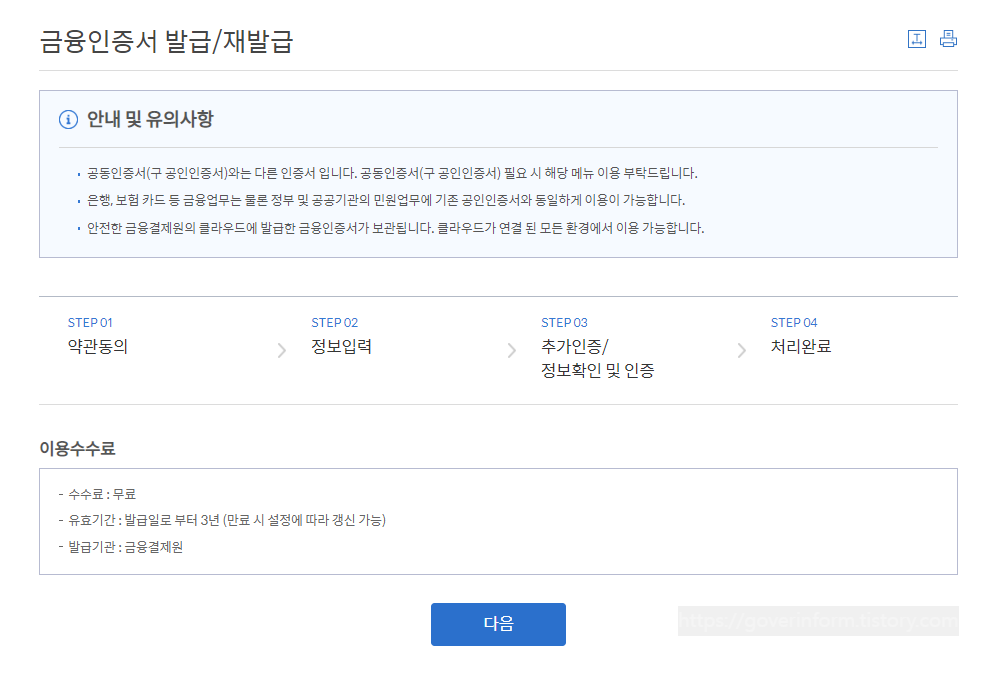 인증서 발급을 위해서는 4단계가 필요합니다. 약관동의, 정보입력, 추가인증/정보확인 및 인증을 마치면 인터넷뱅킹 이용을 위한 준비가 마무리 됩니다.