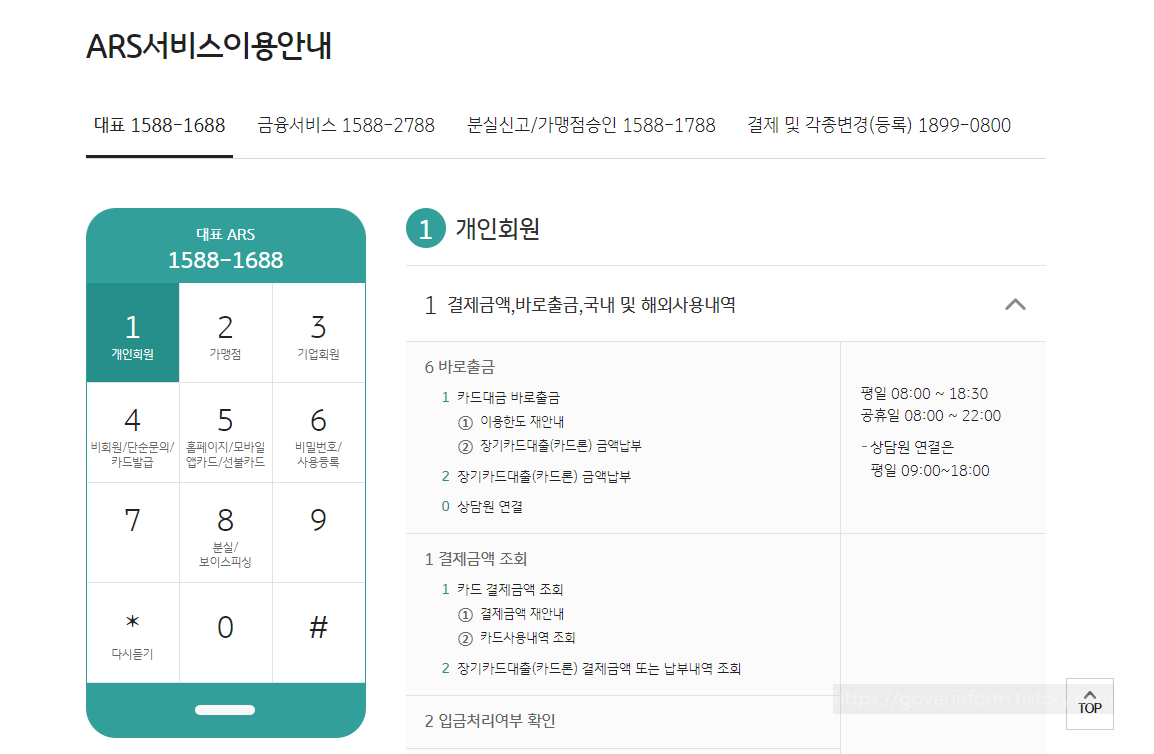 각 번호마다 이용서비스가 적혀있습니다. ARS는 24시간 이용할수 있으며 상담원 연결은 평일 오전 9시부터 오후6시까지입니다.