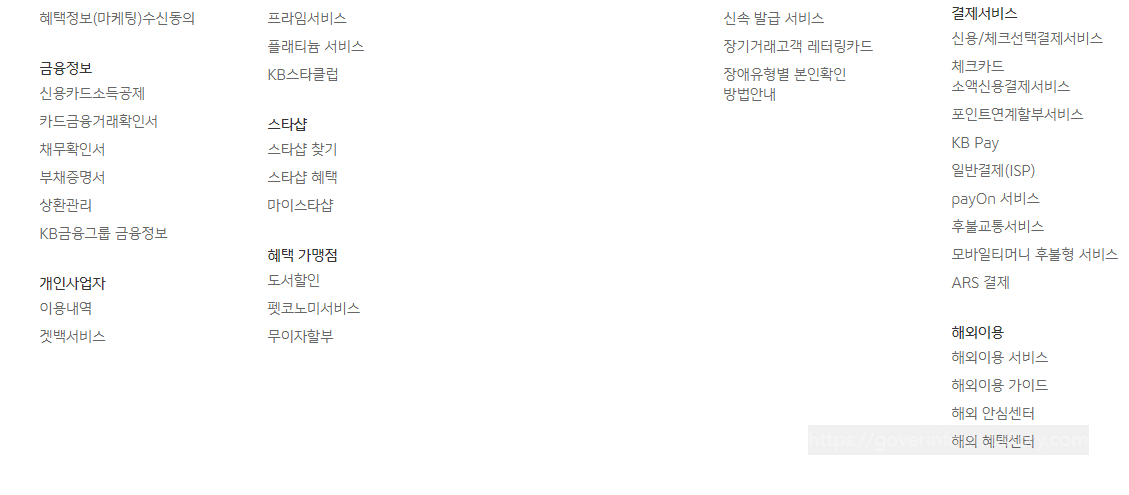 ARS고객센터 이용방법외에도 홈페이지에는 1. 카드이용 (결제예정금액, 이용대금명세서, 이용내역 매출전표, 카드이용실적 혜택, 이용한도, 가족카드) 2. 대금결제 (카드대금결제, 분할납부 할부관리, 결제내역) 3. 저보관리 (내정보관리, 소유카드관리, 결제일 계좌관리, 혜택정보 수신동의) 4. 금융정보 (신용카드소득공제, 캌드금융거래확인서, 채무확인서) 5. 혜택 6. 금융 7. 카드 8. 서비스 등의 다양한 서비스가 있습니다.
