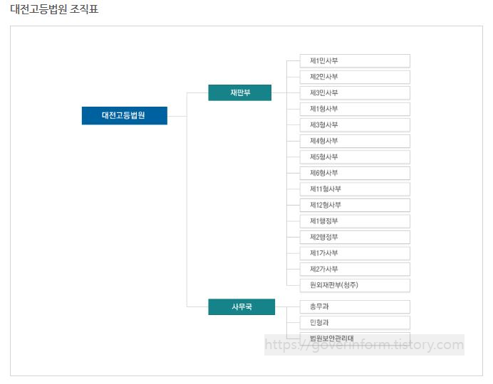 대전고등법원 조직도이다. 재판부 사무국이 있으며 재판부에는 민사부.형사부.행정부.가사부가 있다. 사무국에는 총무과 민형과 법원보안관리대가 있다.