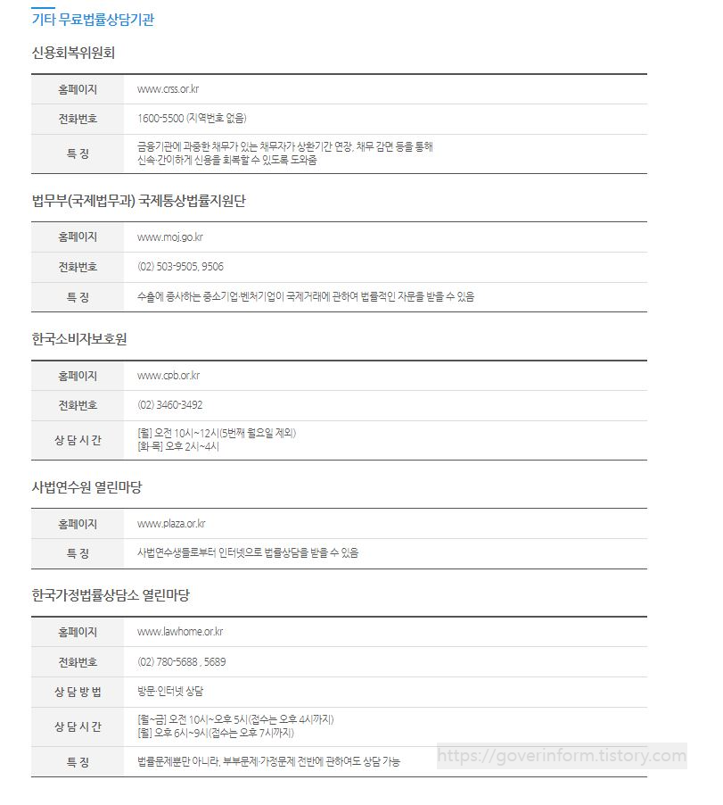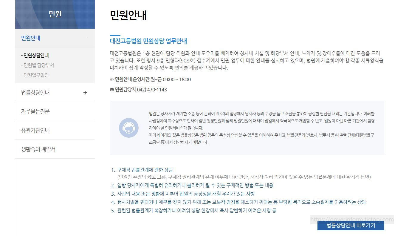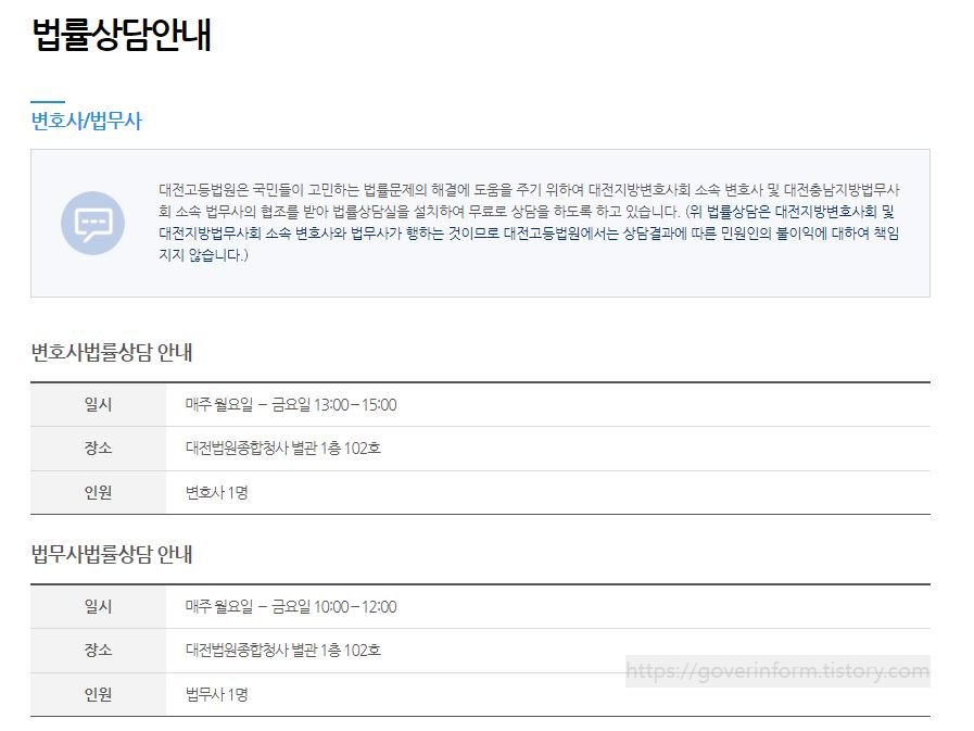 또한 법을 잘모르는 사람들이 받을 수 있는 상담은 대전고등법원 1층뿐만 아니라 전국에 사무소에도 있다. 전화 또는 온라인으로도 상담받을 수 있다. 야간 및 휴일에도 상담받을 수 있는 곳도 있다.